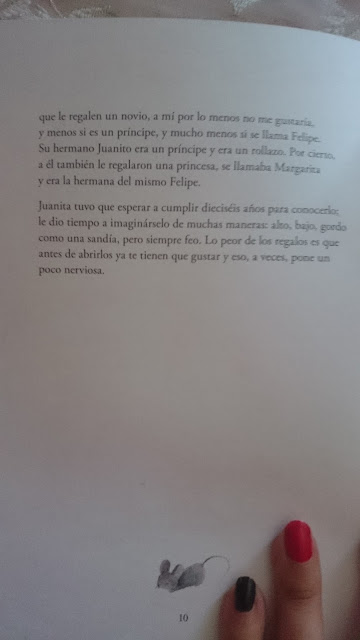 "A Juanita al principio no le hizo mucha gracia; tanta Emoción para Nada. A ella le hubiera gustado más un Caballo o un autógrafo de Cristóbal Colón. A Nadie le hace gracia que le regalen un Novio, a mí por lo menos no me gustaría, y menos si es un Príncipe, y mucho menos si se llama Felipe. Su hermano Juanito era un Príncipe y era un rollazo. Por cierto, a Él también le regalaron una Princesa, se llamaba Margarita y era la hermana del mismo Felipe."